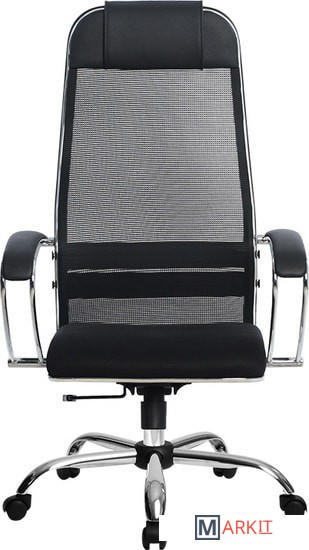- высокая замкнутая сверху спинка кресла с мягким накладным подголовником;- мягкое объемное сиденье;- черное полимерное покрытие каркаса с хромированным молдингом;- стальные классические подлокотники, покрытые зеркальным хромом;- обивка спинки – сетка натяжная без прошивки (сетка Х2);- обивка сиденья – износостойкая ткань обивочная сетчатая без прошивки.