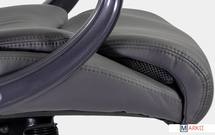 Кресло имеет широкую эргономичную спинку с поясничной поддержкой, что является важным качеством при выборе кресла руководителя. В области коленей дополнительное утолщение для комфортной посадки.