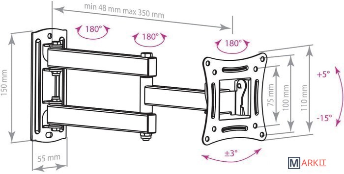 | Угол поворота (без ТВ) | 180 ° |