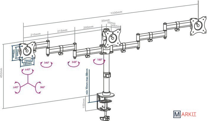 | Максимальная нагрузка | 30 кг (3x10 кг) / 30 кг (по 10 на каждый монитор) |