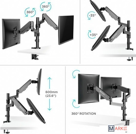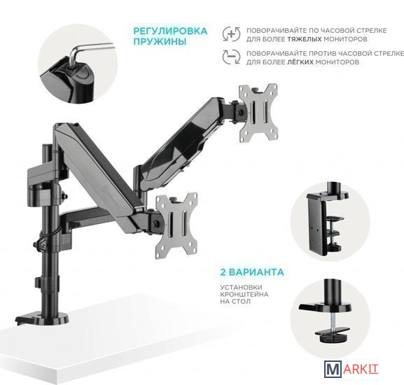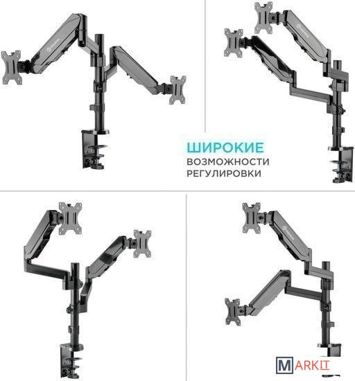 | Функциональные особенности | поворотный, с регулировкой высоты, кабель-канал, струбцинное крепление / поворотный, с регулировкой высоты, кабель-канал, струбцинное крепление, для 2 мониторов |