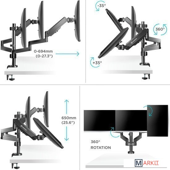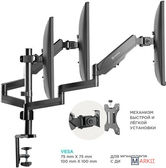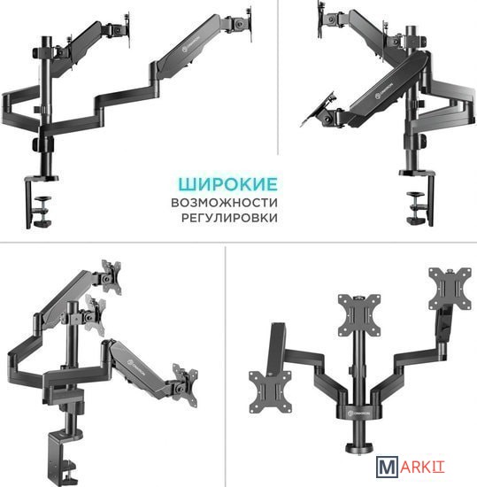 | Функциональные особенности | поворотный, с регулировкой высоты, кабель-канал, струбцинное крепление / поворотный, с регулировкой высоты, кабель-канал, струбцинное крепление, для 3 мониторов |
