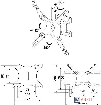 | Угол поворота (без ТВ) | 90 ° |