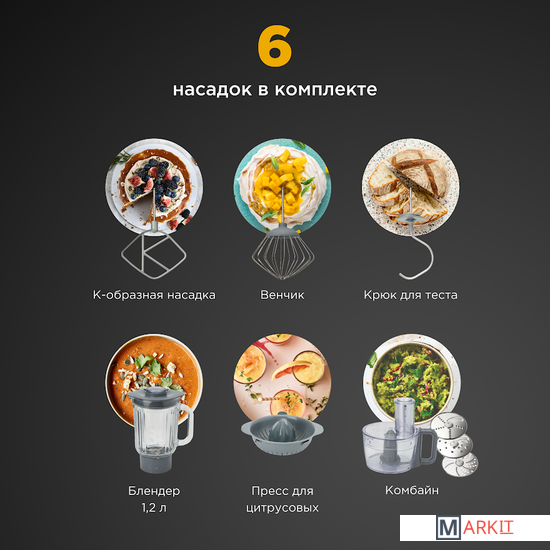 | Функции | блендер, цитрус-пресс, взбивание, смешивание, замешивание дрожжевого теста, измельчитель, рубка, терка, шинковка, ломтерезка, драники |