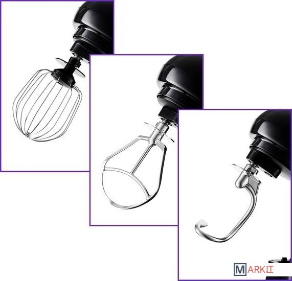 - моторный блок;- чаша миксера;- крышка чаши миксера;- венчик для сбивания;- насадка для смешивания;- крюк;- руководство по эксплуатации. |
