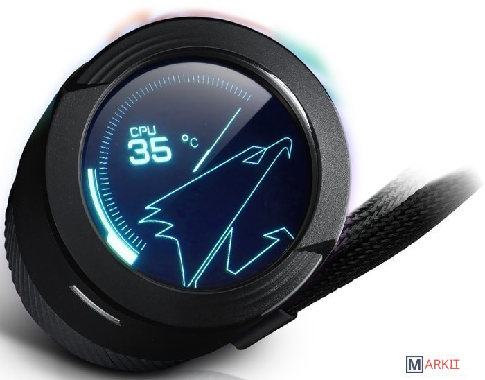 60x60 мм полноцветный ЖК-дисплей, предусмотрена возможность загрузки графической / текстовой информации и воспроизведения видеоконтента.Настраиваемая ориентация дисплея, вращение экрана на 330° относительно оси симметрииПредусмотрена возможность синхронизации подсветки с другими устройствами AORUS средствами утилиты RGB FUSION 2.0.