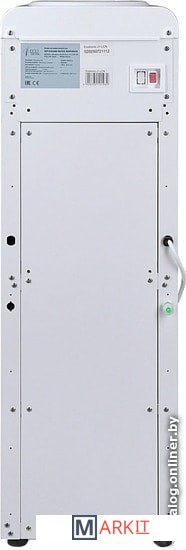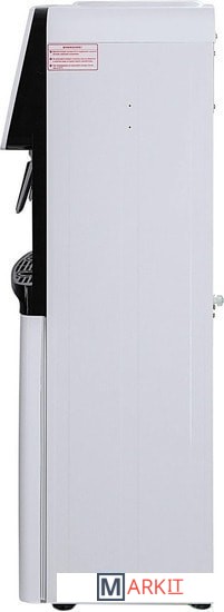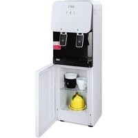 Компактный кулер для воды без охлаждения, только нагрев. С небольшим шкафчиком в нижней части. Корпус белого цвета с черной вставкой в области кранов подачи воды. Индикация режимов работы, нагрева и готовности воды. Краны «нажим кружкой».