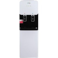 Компактный раздатчик для воды без нагрева и охлаждения. С небольшим шкафчиком в нижней части. Корпус белого цвета с черной вставкой в области кранов подачи воды. Без подключения к сети. Краны «нажим кружкой».