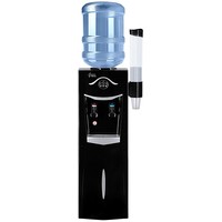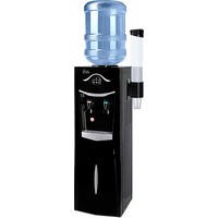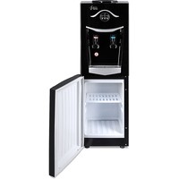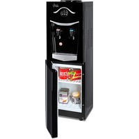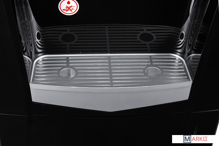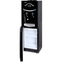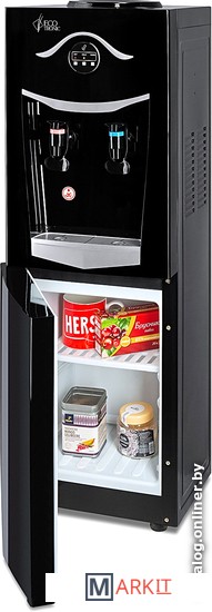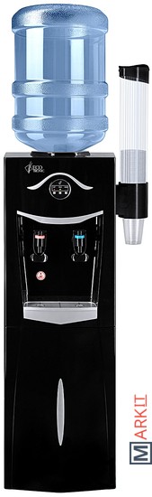 Напольный кулер со шкафчиком. Электронное охлаждение. Корпус черного цвета с серебристой вставкой на лицевой панели. Шкафчик для хранения. Краны нажим «кружкой». Индикация на лицевой панели. Отдельные выключатели на нагрев и охлаждение на задней стенке.
