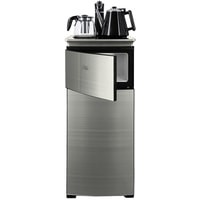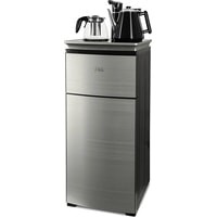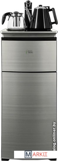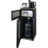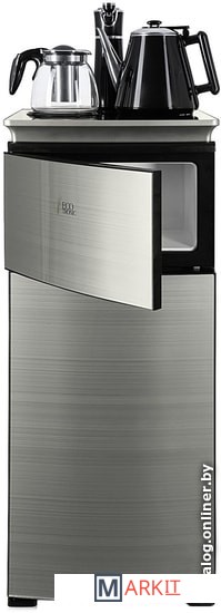 Напольный кулер с чайным столиком. Нижняя загрузка бутыли. Без охлаждения, только нагрев. Нагрев воды в чайнике до 100°С. Два чайника – для кипячения (изотермический) и заварочный. Шкафчик для хранения.Простой, но многофункциональный тиабар:Функция энергосбережения – время работы регулируется от 1 часа до 24 часов.Функция регулировки температуры воды в чайнике позволяет задавать нужную температуру воды в диапазоне от 40°С до 100°С.Функция регулировки времени подачи воды в чайник – возможность задать время подачи воды в чайник (от 18 до 50 сек).На чайном столике расположен кран подачи воды и два чайника, для кипячения и заварочный. Заварочному чайнику можно включить режим постоянного подогрева (~ до 60°С). Чайник кипячения изотермический – меньше греется, лучше сохраняет температуру. Подача воды в него возможна без открытия крышки. Нагрев воды в чайнике включается вручную, либо автоматически в случае использования функции регулировки температуры воды Автоотключение нагрева при температуре 100°С.Панель управления сенсорная, на русском языке, с информационным дисплеем.В верхней части корпуса есть шкафчик для хранения продуктов. Корпус черного цвета, передняя панель – стеклянная, серебристый металлик. Поверхность чайного столика черная с серебристым бортом, чайник для кипячения и кран подачи воды черного цвета с серебристой отделкой.