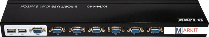 8-портовый KVM-переключатель с портами VGA и 2 портами USB D-Link KVM-440 позволяет осуществлять управление несколькими компьютерами в количестве до восьми с помощью одного монитора, одной клавиатуры и одной мыши. KVM-440 не требует установки драйвера и подключения внешнего адаптера питания. Данный KVM-переключатель поддерживает возможность «горячего» подключения - выполнять установку устройства можно не выключая компьютеры. KVM-440 позволяет быстро и просто переключаться между компьютерами с помощью кнопок, расположенных на передней панели устройства, а также пульта дистанционного управления или внешней панели с кнопками переключения. Устройство поддерживает режим автоматического сканирования, который позволяет автоматически переключиться на следующий ПК по истечении определенного интервала времени. 2 порта USB могут использоваться для подключения внешних устройств, например USB-диска. Данный KVM-переключатель может быть установлен в 19-дюймовую стойку с помощью входящих в комплект поставки кронштейнов.