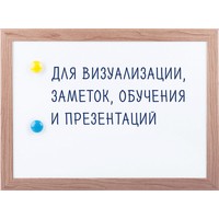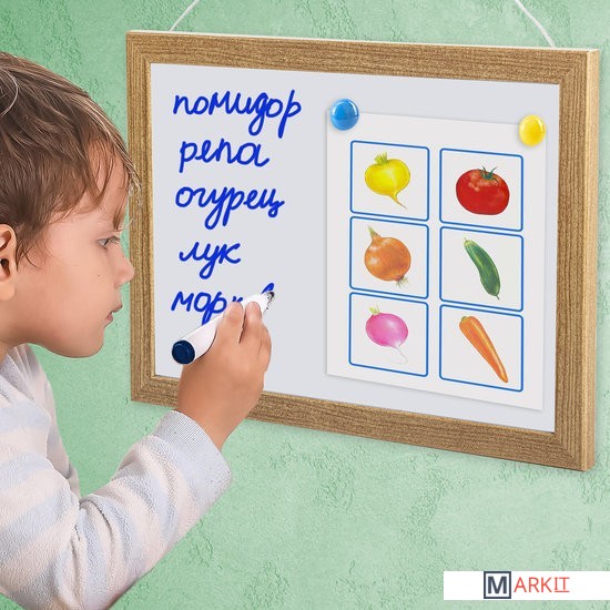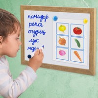 Лаковое покрытие предназначено для письма специальными маркерами для белой доски, а металлическая поверхность позволяет размещать информацию при помощи магнитов. Рама из МДФ придает доске необходимую прочность. Элементы крепления и магниты входят в комплект. Размер — 25х34 см.