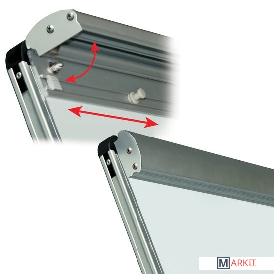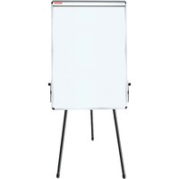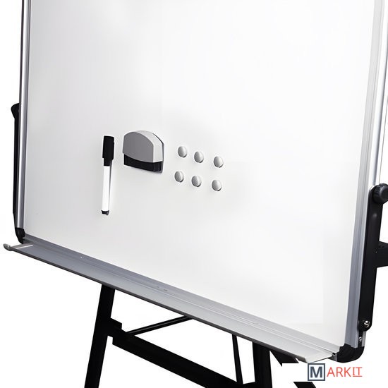 Белое лаковое покрытие предназначено для письма специальными маркерами для белой доски. Размер доски – 100х70 см. Регулируется по высоте до 185 см. Устанавливается на треноге. Металлическая поверхность позволяет размещать объявления при помощи магнитов. Блокнот крепится при помощи неподвижных винтов. Идет в комплекте с лотком для аксессуаров, маркером, стирателем и 4 магнитами. Для защиты рабочей поверхности доски на нее нанесена защитная пленка. Перед началом работы необходимо удалить защитную пленку.