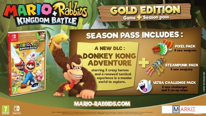| В комплекте | - Игра Mario Rabbids Kingdom Battle со специальным золотым ключом.- Цифровой контент: Сезонный абонемент- ДОПОЛНЕНИЕ Donkey Kong DLC |