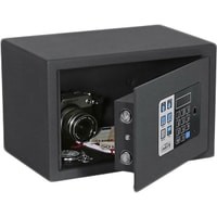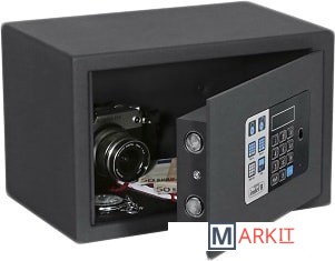 Модель оснащена электронным замком. Питание установки производится посредством четырёх батареек АА мощностью 1,5 В или же с подачей внешнего питания.Сейф оборудован светодиодным освещением, которое автоматически включается на 15 секунд при открывании сейфа.Если пользователь забыл код, то в сейфе предусмотрена возможность аварийного открывания при помощи мастер кода, который обычно устанавливает ответственное лицо отеля. Также сейф можно открыть с помощью механического ключа (приобретается дополнительно).В случае, если установленные в сейфе батарейки разрядились, и вы не успели их заменить — на лицевой панели сейфа есть разъём USB для подключения внешнего блока электропитания. Нужно подключить этот блок и открыть сейф кодом или мастер кодом.