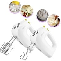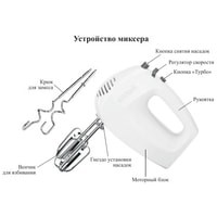 Класс защиты от поражения электрическим током: II;Материал корпуса: пластик;Материал насадок: хромированная сталь;Размеры: 195x80x135 мм;Вес: 0.9 кг.Комплектация:- миксер;- 2 венчика для взбивания;- 2 крюка для замеса;- руководство по эксплуатации.