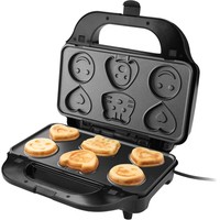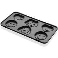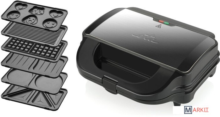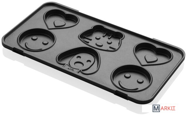 В комплекте шесть съемных пластин с антипригарным покрытием: для приготовления тонких и больших сэндвичей, для гриля, вафель, блинов и детского печенья.
