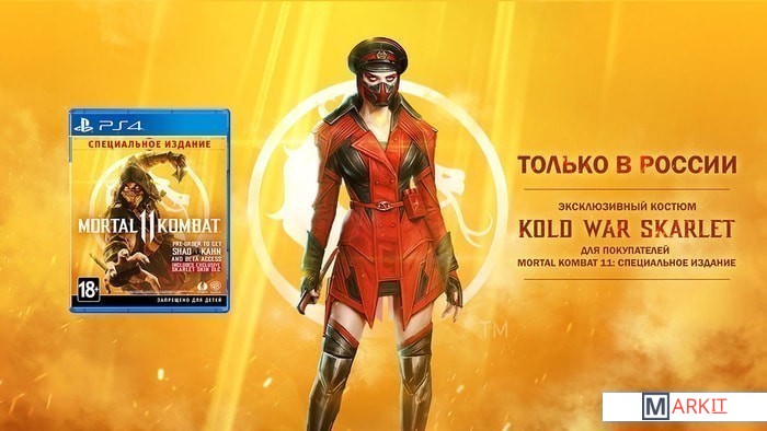 | В комплекте | • Игра Mortal Kombat 11• В первый тираж издания войдет дополнительный боец Шао Кан• Эксклюзивный костюм Kold War Skarlet |