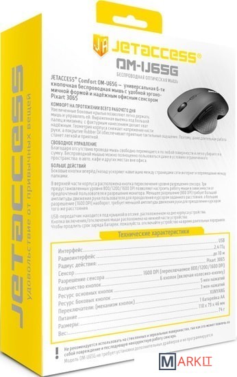 Comfort OM-U65G — универсальная 6-ти кнопочная беспроводная мышь с удобной эргономичной формой и офисным сенсором Pixart 3065.Увеличенные боковые крылья позволяют легко держать мышь и управлять ей. Выраженная выемка под большой палец и мизинец с фактурным нанесением делает хват надёжным. Геометрия корпуса снижает напряжение кисти руки, а покрытие Rubber Oil обеспечивает приятные тактильные ощущения. В верхней части корпуса расположена кнопка переключения уровня разрешения сенсора. Три предустановленных уровня 800/1200/1600 DPI позволяют настроить работу мыши в зависимости от предпочтений пользователя и разрешения монитора. Меньшее разрешение (800 DPI) требует большей амплитуды движения руки пользователя для преодоления курсором заданного расстояния, а большее разрешение (1600 DPI) наоборот, требует меньшей амплитуды движения руки для преодоления курсором того же расстояния.USB-передатчик находится под крышкой в отсеке, расположенном на дне корпуса устройства.Кнопка включения/отключения мыши расположена на нижней части устройства.Чтобы продлить срок заряда батареи, пожалуйста, отключайте устройство на время длительных перерывов.