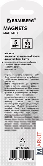 Markit » Аксессуары для офисных досок » Набор магнитов BRAUBERG 231729 (5шт)