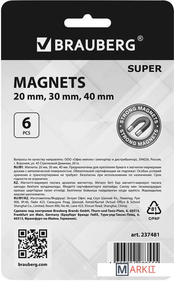 Markit » Аксессуары для офисных досок » Набор магнитов BRAUBERG Super 237481 (6шт)