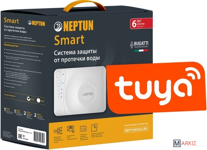 Умная система защиты от протечки воды Neptun BUGATTI Smart Tuya предназначена для обнаружения и локализации протечек воды в системах водоснабжения. Компоненты системы связаны и взаимодействуют друг с другом через центральный контроллер (модуль управления Neptun Smart), который может быть дополнительно укомплектован дополнительными платами расширения:• RS-485 (для систем диспетчеризации)• Ethernet (для проводного подключения в случае невозможности организации подключения к Wi-Fi)• Счетчики воды (для контроля показаний расхода воды с приборов учета ГВС и ХВС)• Радиодатчики (для организации соединения с датчиками Neptun Smart 868)Контроль протечки воды осуществляется автоматически, не требует участия пользователя, а также позволяет проводить мониторинг системы с помощью приложения Tuya Smart.Функции:• Контроль протечки воды• Автоматическая блокировка водоснабжения при срабатывании любого датчика• Звуковая и световая сигнализация об аварии• Запоминание состояния аварии до устранения ее последствий• Защита шарового крана от закисания (Автоматический проворот крана один или два раза в месяц)• Отправка push-уведомлений о состоянии системы на смартфон• Мониторинг приборов учета расхода воды (счетчиков)• Удаленное управление подачей воды при помощи смартфона