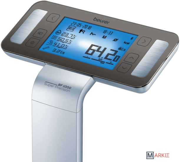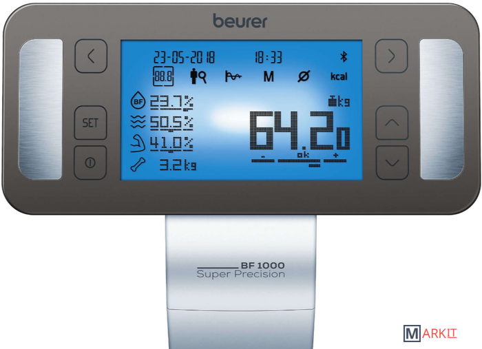 Весы Beurer BF 1000 Super Precision предназначены для профессиональной диагностики веса человека в домашних условиях. Благодаря им можно определить массу тела, ИМТ, долю жировой массы, долю тканевой жидкости, долю мышц, долю массы костей в кг, значения основного обмена веществ и активного обмена веществ (ккал). Все значения легко читаются на дисплее, а также могут быть перенесены в приложение Beurer HealthManager для долгосрочного мониторинга.