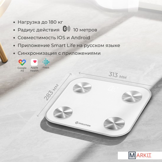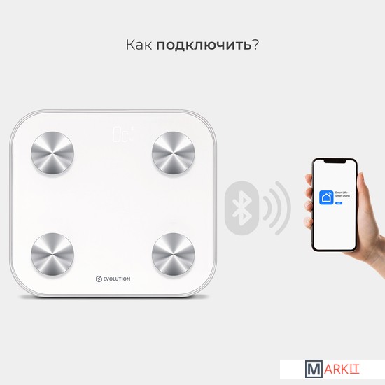 Умные весы EVOLUTION измеряют вес и проводят диагностику Вашего тела. Весы синхронизируются со смартфоном через Bluetooth и автоматически передают данные в приложение "Smart Life", которое совместимо IOS 8.0 и новее, Android 5.0 и новее.Приложение "Smart Life" на русском языке и интуитивно понятно. Для корректной оценки состояния тела в приложении нужно ввести возраст, пол и рост. Все данные носят справочный характер.Включаются и отключаются автоматически. Есть индикаторы низкого заряда и перегрузки. Прорезиненные ножки. Работают от батареек: 4 шт типа ААА, которые не входят в комплект.