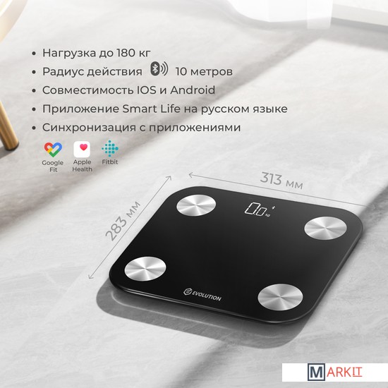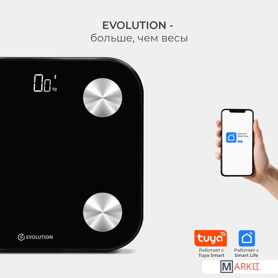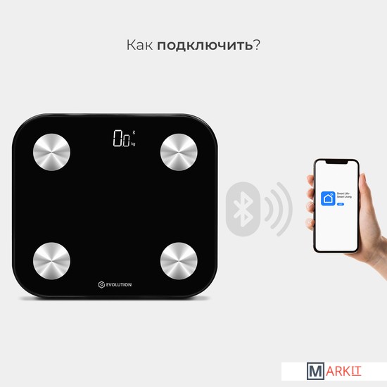 Умные весы EVOLUTION измеряют вес и проводят диагностику Вашего тела. Весы синхронизируются со смартфоном через Bluetooth и автоматически передают данные в приложение "Smart Life", которое совместимо IOS 8.0 и новее, Android 5.0 и новее. Приложение "Smart Life" на русском языке и интуитивно понятно. Для корректной оценки состояния тела в приложении нужно ввести возраст, пол и рост. Все данные носят справочный характер. Включаются и отключаются автоматически. Есть индикаторы низкого заряда и перегрузки. Имеют прорезиненные ножки. Работают от батареек: 4 шт типа ААА, которые не входят в комплект.