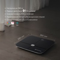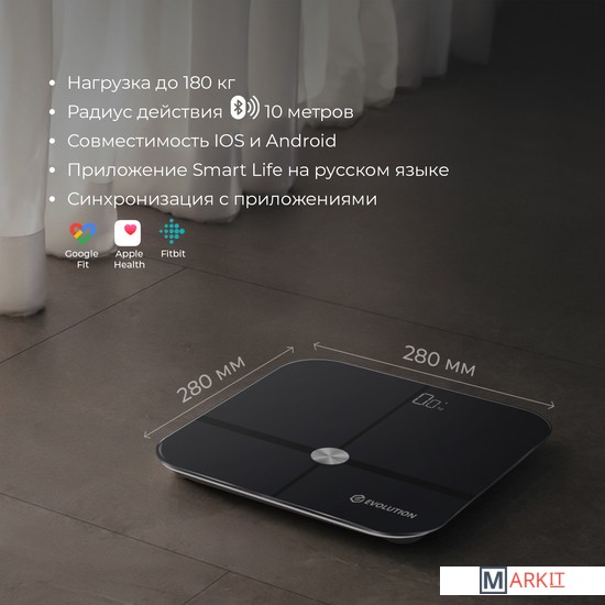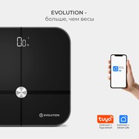 Умные весы EVOLUTION измеряют вес и проводят диагностику Вашего тела. Весы синхронизируются со смартфоном через Bluetooth и автоматически передают данные в приложение "Smart Life", которое совместимо IOS 8.0 и новее, Android 5.0 и новее. Приложение "Smart Life" на русском языке и интуитивно понятно. Для корректной оценки состояния тела в приложении нужно ввести возраст, пол и рост. Все данные носят справочный характер. Включаются и отключаются автоматически. Есть индикаторы низкого заряда и перегрузки. Прорезиненные ножки. Работают от батареек: 4 шт типа ААА, которые не входят в комплект.