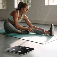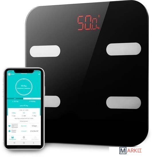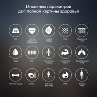 | Функциональные особенности | расчет доли воды, расчет доли жировой ткани, расчет доли мышечной ткани, расчет доли костной ткани, расчет ИМТ (BMI), расчет ПБМ (BMR), расчет уровня белка, расчет биологического возраста, пульс (в приложении) |