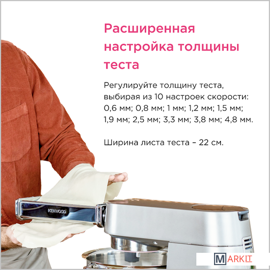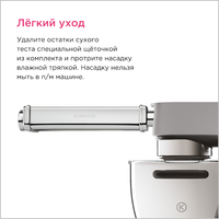 Насадка для кухонного комбайна Kenwood KAX99.A0ME станет незаменимым помощником в раскатывании теста для пасты. ИТАЛЬЯНСКИЕ БЛЮДА НА ДОМАШНЕЙ КУХНЕ Настоящую пасту можно готовить дома с помощью насадки для кухонного комбайна Kenwood KAX99.A0ME. Тесто после раскатки на насадке от Kenwood получается ровным, гладким и идеальной толщины для дальнейшего приготовления пасты. Получите более широкие листы с насадкой 22см. Благодаря 10 настраиваемым режимам Вы можете получить тесто необходимой ширины для приготовления лазаньи, равиоли и тортеллини. Широкая насадка идеально подходит для приготовления лепешек и питты. Насадка удобна в использовании. Ее можно с легостью очистить после использования, к ней не прилипает тесто, не деформируется и не поддается коррозии, а так же в комплекте идет щеточка, которая сделает уход за насадкой еще более простым. Важно, насадку нелья мыть, только протирать влажной салфеткой.
