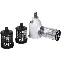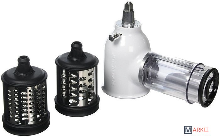 Насадка-овощерезка KitchenAid - эта насадка чрезвычайно полезна и используется намного чаще других насадок в большинстве рецептов. В комплект овощерезки входят три стандартных насадки для средней, крупной и мелкой резки. Все три варианта превосходно подходят для приготовления салатов, резки картофеля, измельчения фруктов и сыра. Если в середине рецепта вам потребуется переключить режим с резки на шинковку, вам не придется снимать всю насадку с миксера, необходимо только заменить соответствующий нож и продолжать измельчение в ту же чашу.