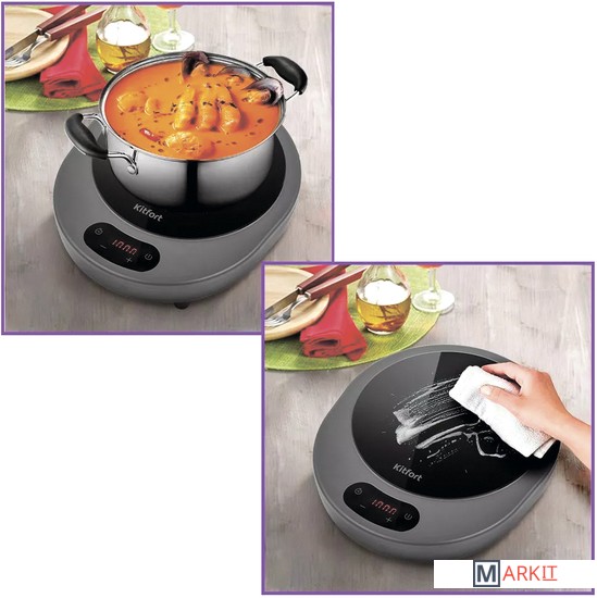 Готовьте с удовольствием!Плита КТ-156 – ваш лучший помощник на кухне: приготовление любимых блюд станет простым и безопасным. Индукционная плита позволяет избежать возникновения огня, дыма и гари, поэтому её использование будет максимально комфортным.Управляйте процессом приготовления!Используя сенсорную панель управления, вы можете настроить нужный нагрев 1900 Вт и таймер до 24 часов. Для безопасности в плите встроена функция автоотключения: если плита не получает никаких команд в течение 3 часов, она автоматически отключается.Нагревает только посуду!Рабочая поверхность плиты не нагревается непосредственно во время приготовления пищи. При этом происходит мгновенный нагрев из-за контакта с разогретым дном посуды. А если убрать посуду с поверхности, нагревание немедленно прекратится.Защита от перегреваНа обратной стороне КТ-156 встроен вентилятор, который способствует быстрому охлаждению плиты во время интенсивной работы и после её завершения. Если же дно посуды перегрелось, и температура поверхности достигла 320°C, плита автоматически выключится.Простое использованиеДля плиты КТ-156 подходит посуда с дном из ферромагнитных материалов: стальная, чугунная, эмалированная посуда, посуда из нержавеющей стали, а также любая другая, предназначенная для индукционного нагрева. Плита выдерживает вес не более 10 кг.Всегда чисто!С плитой КТ-156 можно не ждать остывания поверхности, чтобы очистить её от остатков еды и загрязнений. Поскольку поверхность индукционной плиты не нагревается, вы можете легко и быстро навести порядок на кухне сразу после приготовления любимого блюда!Удобство храненияКТ-156 – это компактная настольная индукционная плита. В случае необходимости прибор можно легко убрать на время в шкаф или ящик на кухне, взять с собой в путешествие или на дачу. Универсальность размеров делает КТ-156 лучшим помощником в любых условиях!