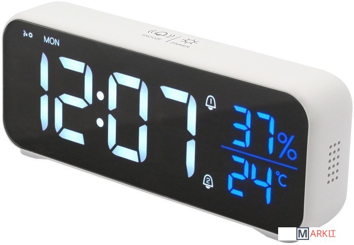 Особенности:— Современный дизайн— Возможность работы от аккумулятора/USB/сети— Яркие, заметные издали цифры— Регулируемая яркость— Запоминание настроек при отключении питания— Качественный приятный звук будильника— Встроенный термометр и гигрометр— USB-выход для зарядки гаджетов— Возможность настройки разных режимов будильника (будни/выходные)