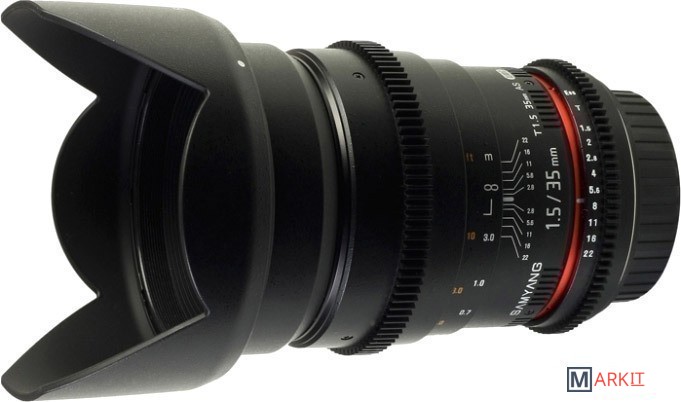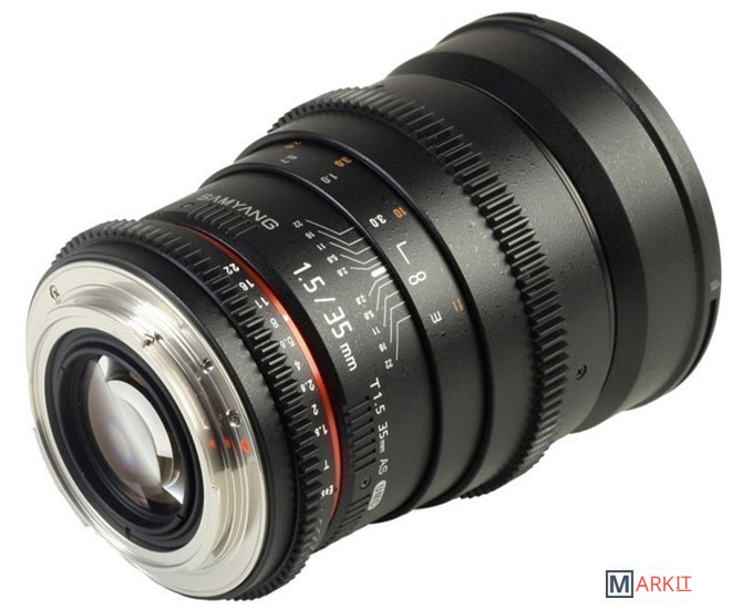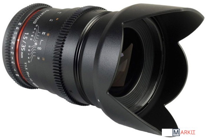 Широкоугольный объектив с ручной фокусировкой Samyang 35 mm T 1,5 ED AS UMC VDSLR предназначен для полноразмерных цифровых фотоаппаратов. Сделан специально для использования с механизмами видеосъёмки цифровыми зеркальными фотоаппаратами. На корпусе объектива нанесена шкала дистанции и диафрагмы с поворотом на 90 градусов. Фокусировочное кольцо и кольцо диафрагмы имеет специальную зубчатую передачу и плавный ход. Объектив выполнен в надежном и качественном корпусе из металла и пластика с металлическим байонетом.