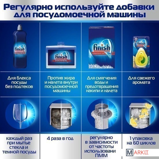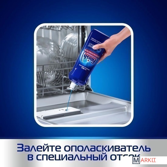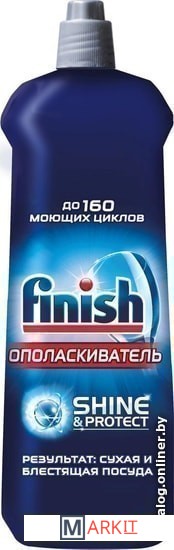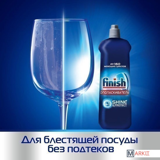 Ополаскиватель Finish — это защита от образования пленки и пятен (довольно частое явление, если использовать только порошок), с ним ваша посуда буквально сияет чистотой. Ополаскиватель Finish усиливает действие порошка и помогает начисто смыть пятна и жирную пленку, так что ваша посуда, бокалы и столовые приборы остаются идеально чистыми. Ополаскиватель Finish с 5 мощными функциями:• устранение подтеков;• ускорение процесса сушки;• устранение следов от капель;• защита от известкового налета;• придание исключительного блеска. ВНИМАНИЕ! Ополаскиватель Finish начинает действовать только в цикле ополаскивания, поэтому тщательно очистите вашу посуду от остатков еды перед загрузкой посудомоечной машины. Как использовать: просто залейте ополаскиватель Finish в специальный дозатор посудомоечной машины: тогда он будет подаваться автоматически при каждом споласкивании. Добавляйте ополаскиватель, когда загорится соответствующий индикатор на панели управления посудомоечной машины.