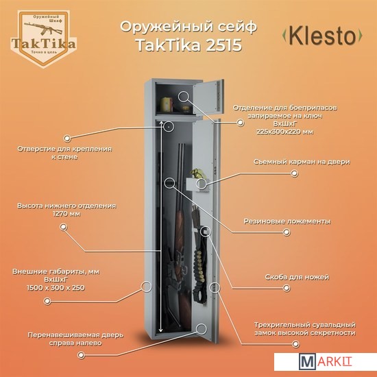 Металлический оружейный шкаф TakTika 2515 оснащен двумя надежными сувальдными замками повышенной секретности с тремя ригелями. Сейф позволяет хранить до трех ружей с дополнительными аксессуарами. Особенностью шкафа является независимое запираемое отделение с ключевым сувальдным замком, съемный карман для аксессуаров и сварная скоба для инвентаря. Предусмотрены отверстия для крепления к полу и стене. Шкаф укомплектован съемными резиновыми держателями, что позволяет крепко зафиксировать ствол ружья исключая смещение оружия внутри шкафа. Мягкий коврик позволит аккуратно и бережно устанавливать ружье без риска повредить приклад. Дверь усилена металлическим коробом, который не только закрывает замки, но и обеспечивает дополнительную жесткость конструкции, а так же позволяет перевешивать дверь справа налево. Максимальная длина оружия, размещаемого в сейфе - 1260 мм. Шкаф покрашен износостойкой порошковой краской.