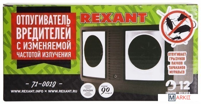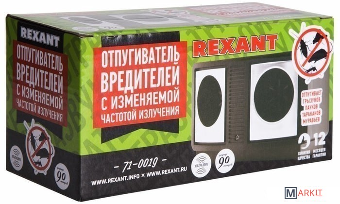 Отпугиватель вредителей REXANTс изменяемой частотой излученияПредназначен для отпугивания грызунов, пауков, тараканов, муравьев, моли и других вредителей путем излучения ультразвуковых волн на дискомфортных для них частотах. Регулятор частоты излучения позволяет менять частоту сигнала воздействия, тем самым препятствуя привыканию у вредителей.Отпугиватель вредителей с изменяемой частотой излучения является безопасным, компактным, простым в эксплуатации устройством, обеспечивающим надежную защиту помещения от вредителей. Для людей и домашних животных не представляет опасности.Радиус работы: 90 метров