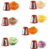 Слайсер может нарезать картофель на тонкие ломтики для жарки, либо фрукты и овощи для украшения блюд и пр.Терка с волнистыми ножами подходит для нарезки фруктов и овощей на оформление различных блюдКрупная терка используется для шинковки овощей на суп, для приготовления картофельных блинов либо овощных и фруктовых салатов и т. д.Мелкая терка подходит для приготовления фруктовых и овощных салатов либо сырных и овощных паст и т. д.Очень мелкая терка предназначена для измельчения / помола кокоса, миндаля, орехов и для приготовления крошек из твердого хлеба и т. д.