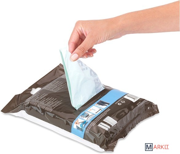 Удобно и быстро вкладываются и достаются из бака.Вентиляционные отверстия для удобства вкладывания в бак.Изготовлены из особо прочного полиэтилена (HDPE).Легко затягиваются и переносятся — специальная лента для стягивания горловины.
