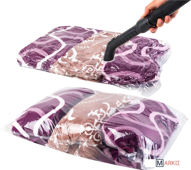 Вакуумный пакет предназначен для компактного хранения и транспортировки постельного белья, одежды, мягких игрушек. Позволяет уменьшить объём занимаемого пространства на 80%. Воздух из пакета удаляется при помощи пылесоса, для это на пакете есть специальный клапан. Клапан работает со всеми видами пылесосов. Вакуумный пакет позволяет защитить находящуюся в нём вещь от воды, грязи, пыли, насекомых, плесени, запаха. Вакуумный чехол применяется для любого вида ткани и материала. Пакет можно использовать много раз, благодаря застежке-зипперу.