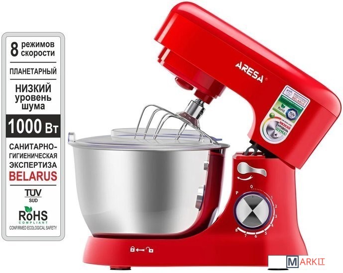 Планетарный миксер AR-1910 белорусского бренда ARESA - незаменимый помощник на кухне. В приборе установлен надежный 1000 ваттный мотор с медной обмоткой, который может выдерживать большие нагрузки. Благодаря редуктору собственной разработки прибор более тихий чем аналоги. В миксере 8 скоростных режимов и импульсный турбо-режим. В комплект входят: чаша емкостью 4,5 л из нержавеющей стали, прозрачная крышка с отверстием, которая защищает от брызг и позволяет добавлять ингредиенты в процессе работы, отделитель желтков, три насадки: венчик для взбивания из нержавеющей стали высокой прочности, крюк для замешивания теста, насадка для смешивания ингредиентов из высокопрочного ABS пластика. Их отличительной чертой от многих конкурентов является надежная конструкция крепления со стальной муфтой, что надолго продлевает срок службы прибора. Корпус миксера изготовлен из толстого и прочного ABS пластика. Пластик не окрашен - поэтому он внутри того же цвета, как и с наружи, а значит прибору не страшны царапины. ARESA – белорусский бренд бытовой техники. Наша техника проходит сертификацию на территории Республики Беларусь в едином центре ГОССТАНДАРТА. Кроме сертификатов таможенного союза, полученных на территории Республики Беларусь, техника ARESA соответствует всем нормам сертификации Европейского Союза и поставляется на его территорию. Приобретая нашу технику, вы заботитесь о здоровье и безопасности вас и ваших близких.
