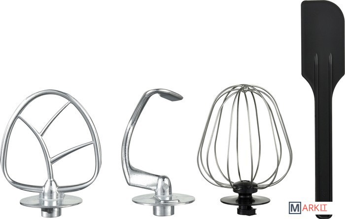 миксер, чаша из нержавеющей стали, крышка чаши, крючок для замеса теста, лопатка для перемешивания, венчик для взбивания, лопатка, гарантийный талон, инструкция на русском языке