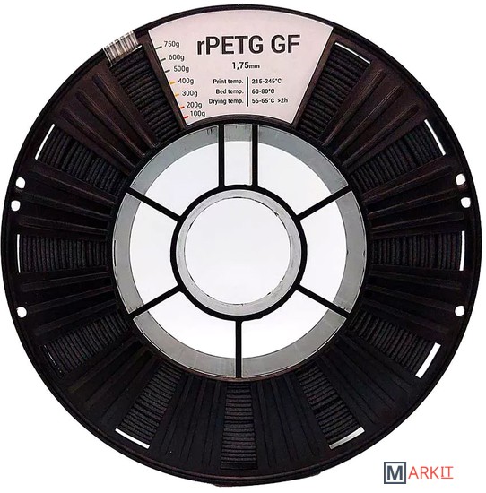 rPetg GF - прост и удобен в работе, практически лишен термоусадки и дает отличные поверхности 3D-печатных изделий. Единственное существенное отличие от PETG заключается в необходимости использования износостойких сопел, например из закаленной стали, обусловленной повышенной абразивностью. Материал доступен в пяти цветах — черном, белом, сером, красном и желтом.В производстве композиционной нити используются крошечные стекловолокна, которые вводятся в основной материал для улучшения его свойств. Содержание стекловолокна составляет 15%. Филамент демонстрирует высокую межслойную адгезию и низкую усадку, облегчающие 3D-печать и в немалой степени обуславливающие популярность этого полимера в аддитивной сфере. Неприятные запахи при работе с rPETG GF тоже отсутствуют.Сферы применения включают производство как прототипов, так и конечных изделий: корпусов приборов, защитных кожухов, емкостей различного назначения, деталей механизмов, функциональных изделий для размещения на улице и многого другого.Температура размягчения rPETG GF составляет 70°С — ниже, чем у ABS-пластика (105°С), но выше, чем у PLA-пластика (55°С). В большинстве климатических зон это позволяет использовать изделия из rPETG GF вне помещений без деформаций от солнечного нагрева.Обязательно использование стального сопла!Каждая катушка упакована в многоразовый вакуумный пакет с силикагелем, чтобы при хранении пластик не терял своих свойств.