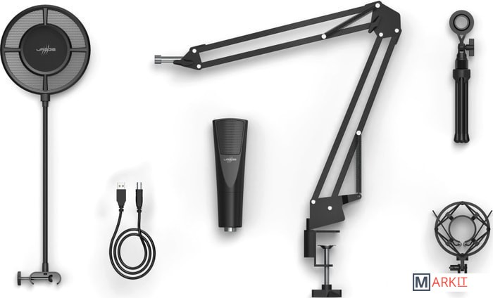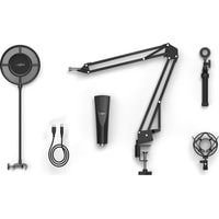 - поп-фильтр- кабель (USB Type-B - USB Type-A)- стойка с настольным зажимом- антивибрационный держатель- документация |