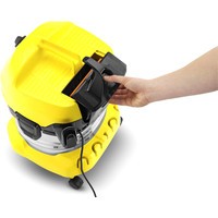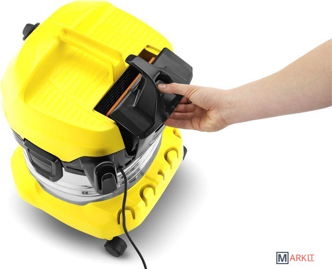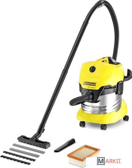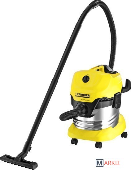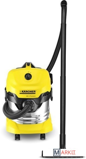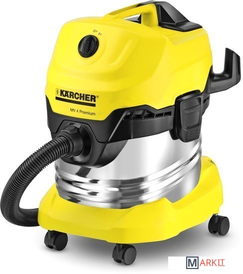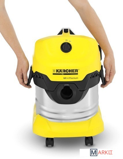 Хозяйственный пылесос Керхер MV 4 Premium. Мощный, надежный, энергоэффективный. Удобный мусоросборник из нержавеющей стали объемом 20 литров, плоский складчатый фильтр в кассете, а также парковочная позиция для перерывов в работе.