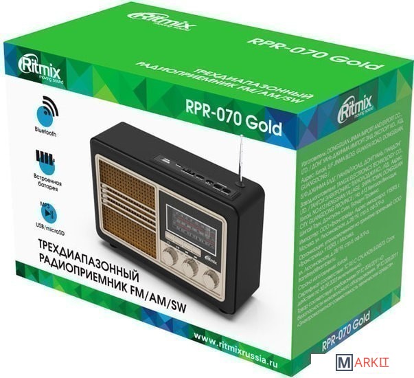 Новый радиоприёмник с дизайнерским корпусом в стиле ретро. Принимает радиопередачи во всех трех основных диапазонах, FM, АМ и SW. Встроенный мр3 плеер, воспроизведение с карт памяти и USB флэш, подключение по Bluetooth и через линейный AUX-аудио вход. Телескопическая антенна. Встроенный заряжаемый аккумулятор, удобные фронтальные кнопки управления и поворотные ручки настройки частоты радио и громкости воспроизведения.