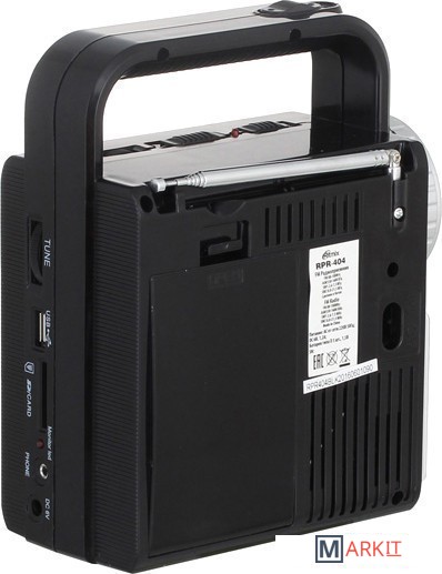 Ritmix RPR-404 – портативный радиоприёмник, работающий на диапазонах FM, AM, SW1, SW2. Устройство поддерживает запись аудио с двух источников: с радио и со встроенного микрофона (функция диктофона). RPR-404 также имеет собственный mp3-плеер, позволяющий воспроизводить аудиофайлы с карт памяти или USB-флэшки. Кроме того устройство имеет два светодиодных фонаря высокой яркости.