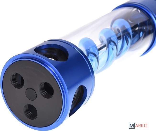 Резервуар для водяного охлаждения из плексигласа с вариантами подключения на выбор: 8 отверстий для возможности подключения всего резервуара или только спирали внутри. Также можно использовать отверстия для установки дополнительных трубок с катодами. Спираль оснащена подсветкой (питание от 4 pin).